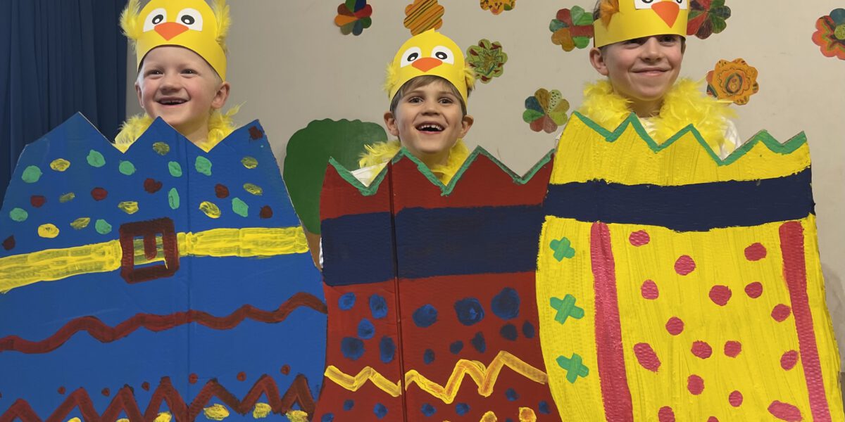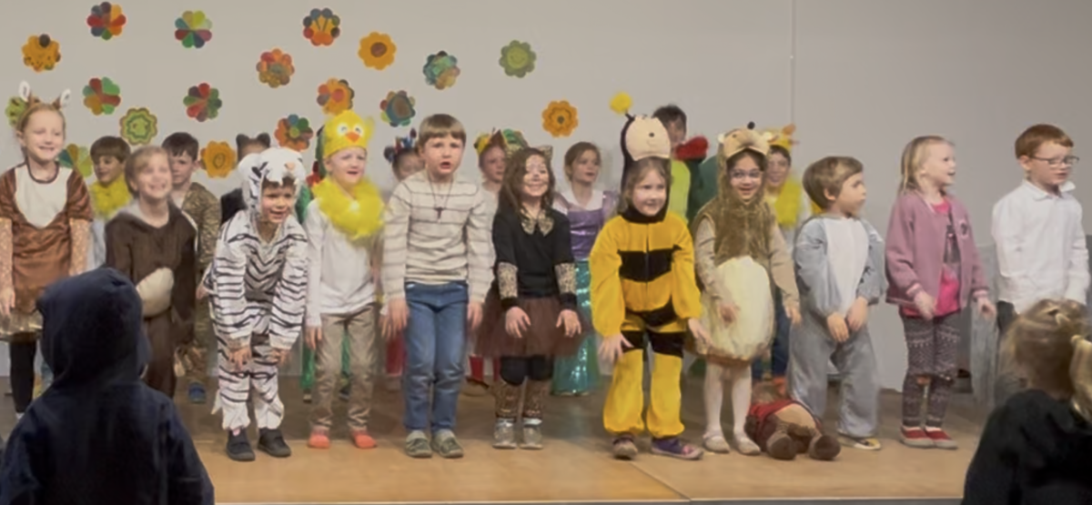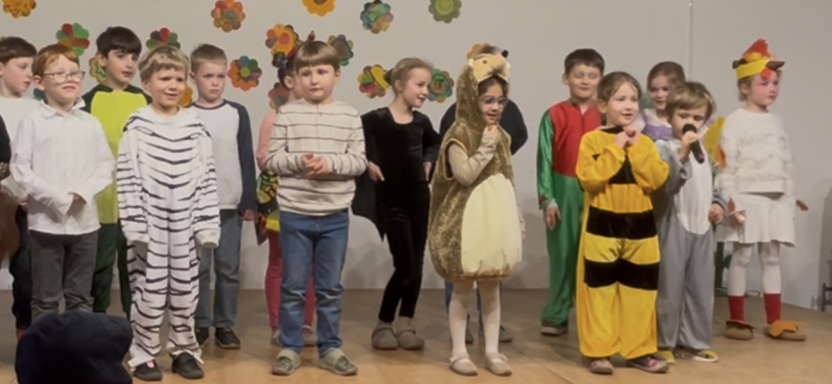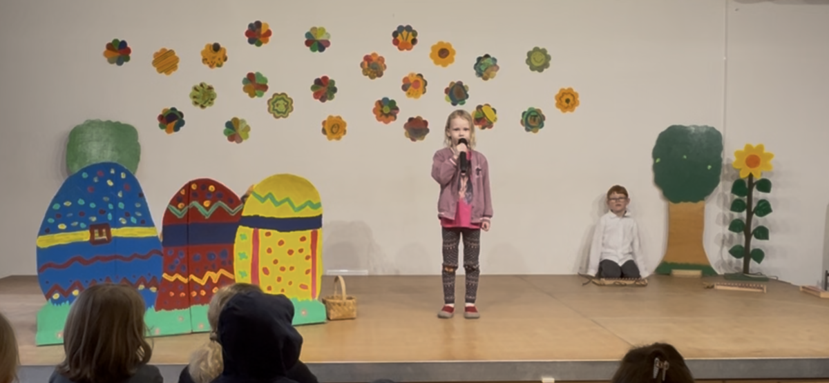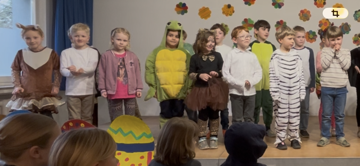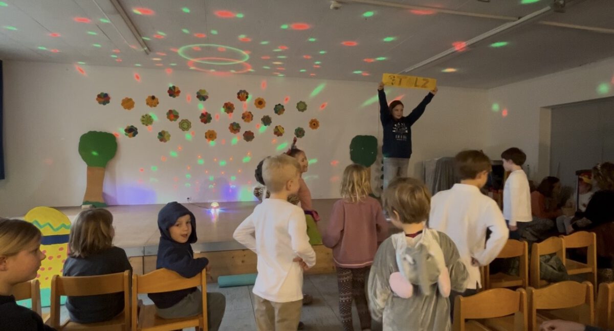 Am Freitag, den 13., luden die Igel der Klasse 1b zum Bühnenprogramm ein. Eltern und Geschwister kamen, um die Igelkinder auf dem Podest zu erleben. Diese hüpften fröhlich zwischen der Zuschauerschar umher, um pantomimisch Gefühle darzustellen und sich so als Schauspielerin und Schauspieler für das kommende Programm aufzuwärmen. Anschließend erzählten alle Igelkinder etwas über sich selbst und stellten sich so den Eltern etwas genauer vor. An den Schultagen zuvor hatten sie in Kleingruppen Rätsel geschrieben, die sie nun zum Besten gaben. Da durfte das Publikum fröhlich mitraten. Im Theaterstück “Bist du unsere Mama?” suchten die Küken Linus, Jaron und Juri ihre Mutter. Leider trafen sie trotz musikalischer Untermalung von Elisa und Jakob bei der Igeldame, dem Schneetiger, der Federmaus und vielen anderen Tieren leider nicht auf die Richtigen. Erst als die Henne Lotti von der Körnersuche zurück kam, war die Freude groß. Und als dann alle Aufregung auf der Bühne besiegt war, tanzten die Igel mit dem Publikum freudig mit “Guter Laune”. Das Wetter war leider nicht so königlich, tat der Freude über das grandios gemeisterte Bühnenerlebnis aber keinen Abbruch. Die Igel waren ein super Team!