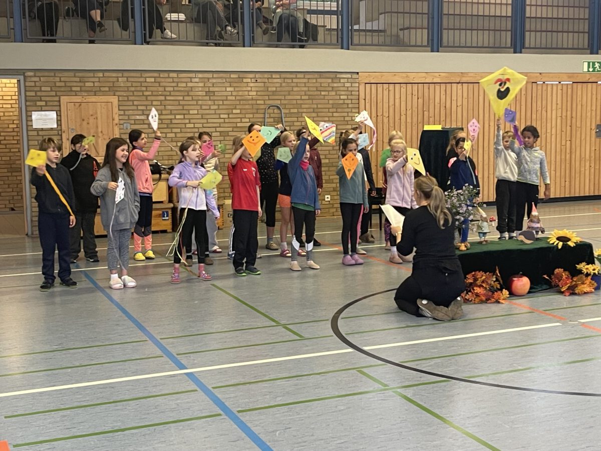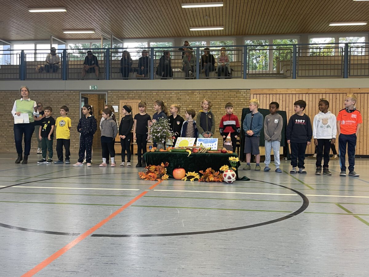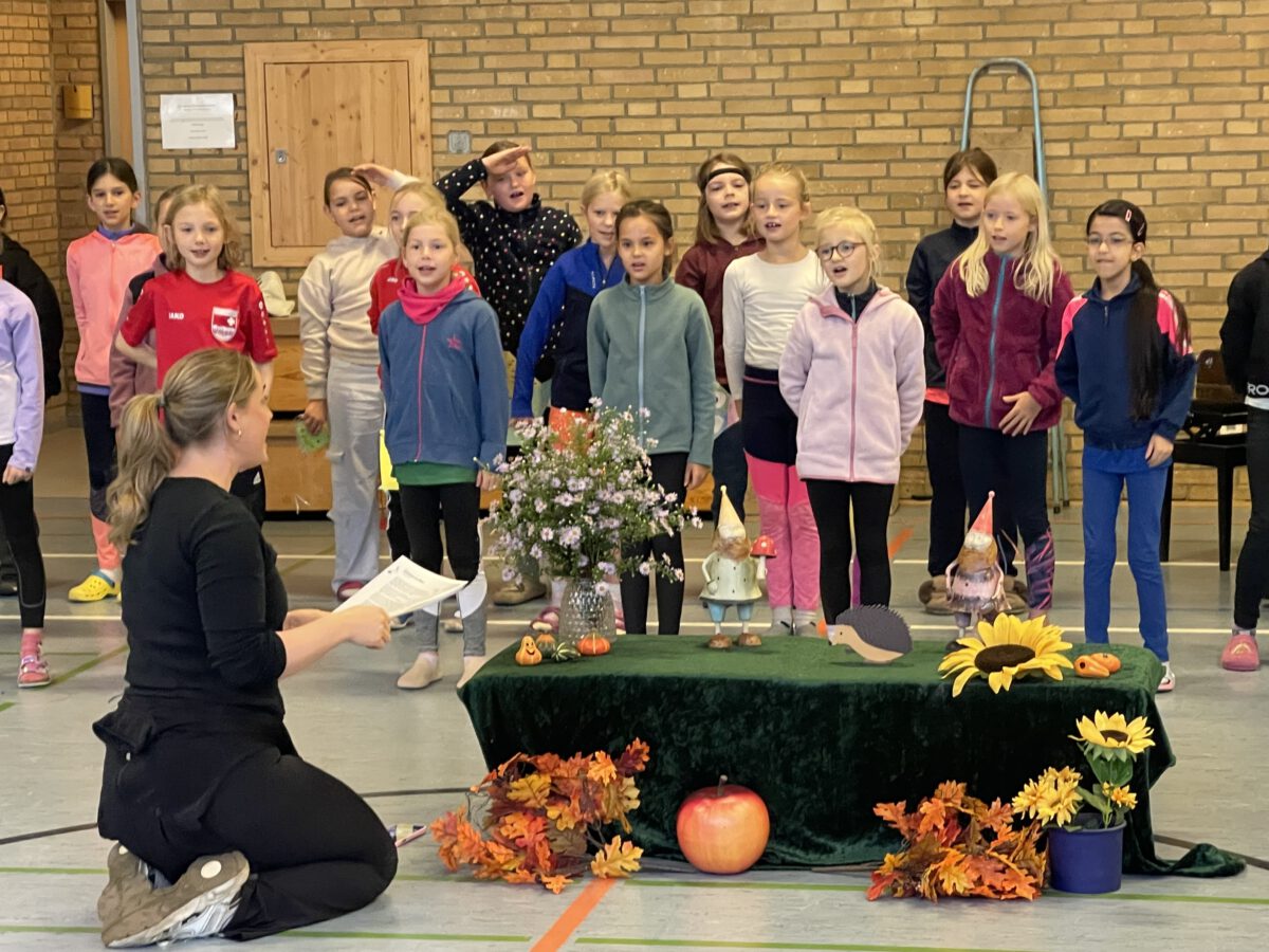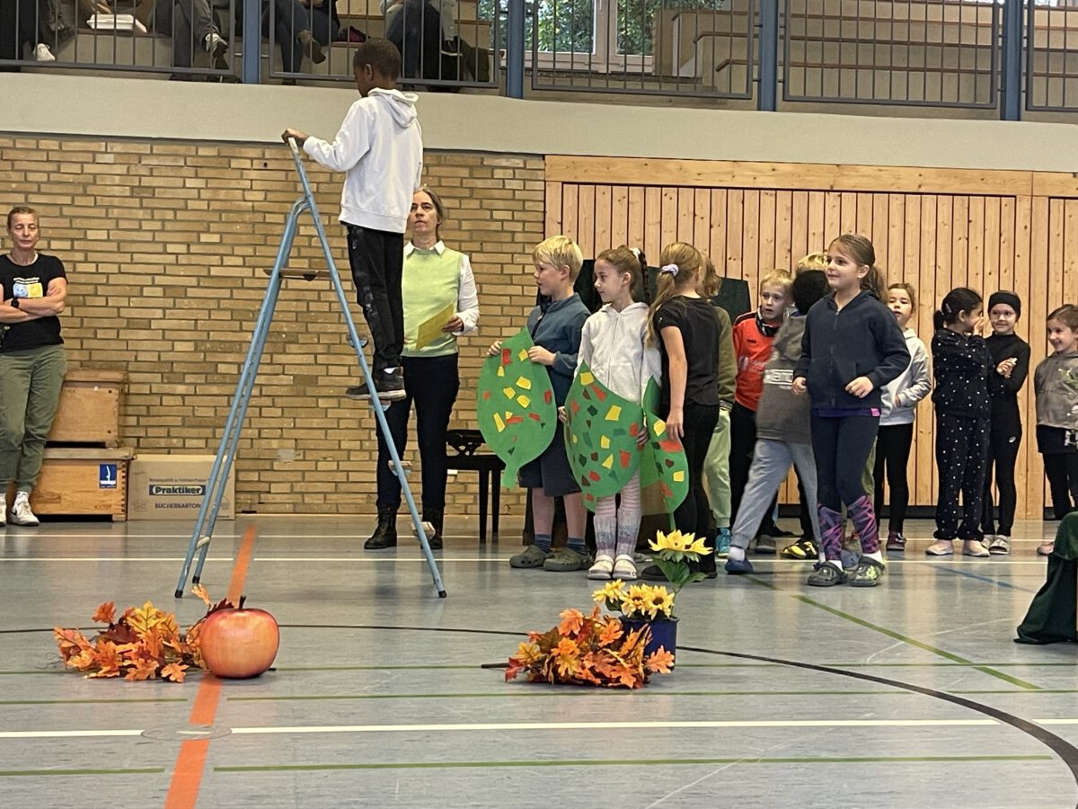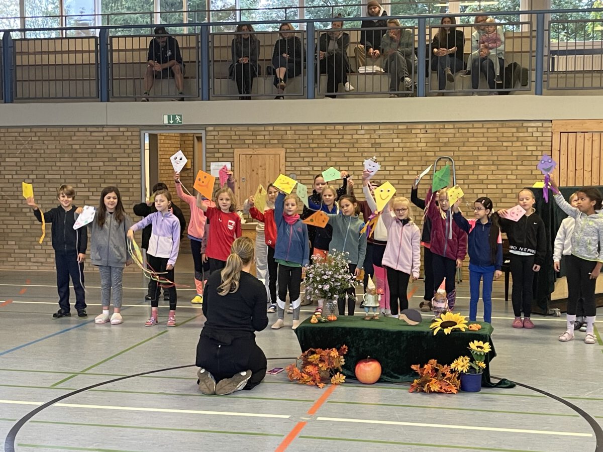 Am letzten Tag vor den Ferien begrüßte die Schülerschar der MCS den bunten Herbst. Gemeinsam trafen sich alle Kinder und Erwachsene in der Turnhalle, um gemeinsam die einstudierten Herbstlieder zu singen. Der Schulchor gab ein kunterbuntes Drachenlied zum Besten, nachdem die Klasse 2b den Herbst die Blätter bunt anmalen ließ und uns die goldenen Garben mit dem Herbstwetter präsentierte. Viel Gelächter war zu hören, als Herr Rixen die Geschichte erzählte, in der Frau Ben Achour und Frau Paul als Igelehepaar den eingebildeten Hasen, gespielte von Frau Winter, im Wettrennen hinters Licht führte und schließlich den Goldtaler als Wetteinsatz mit nach Hause nehmen konnte. Die frohen Herbstlieder noch im Ohr freuten sich alle auf dem Weg zum Sponsorenlauf auf die nahenden Herbstferien.