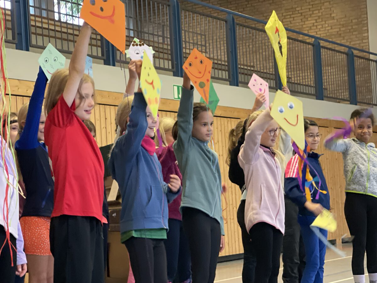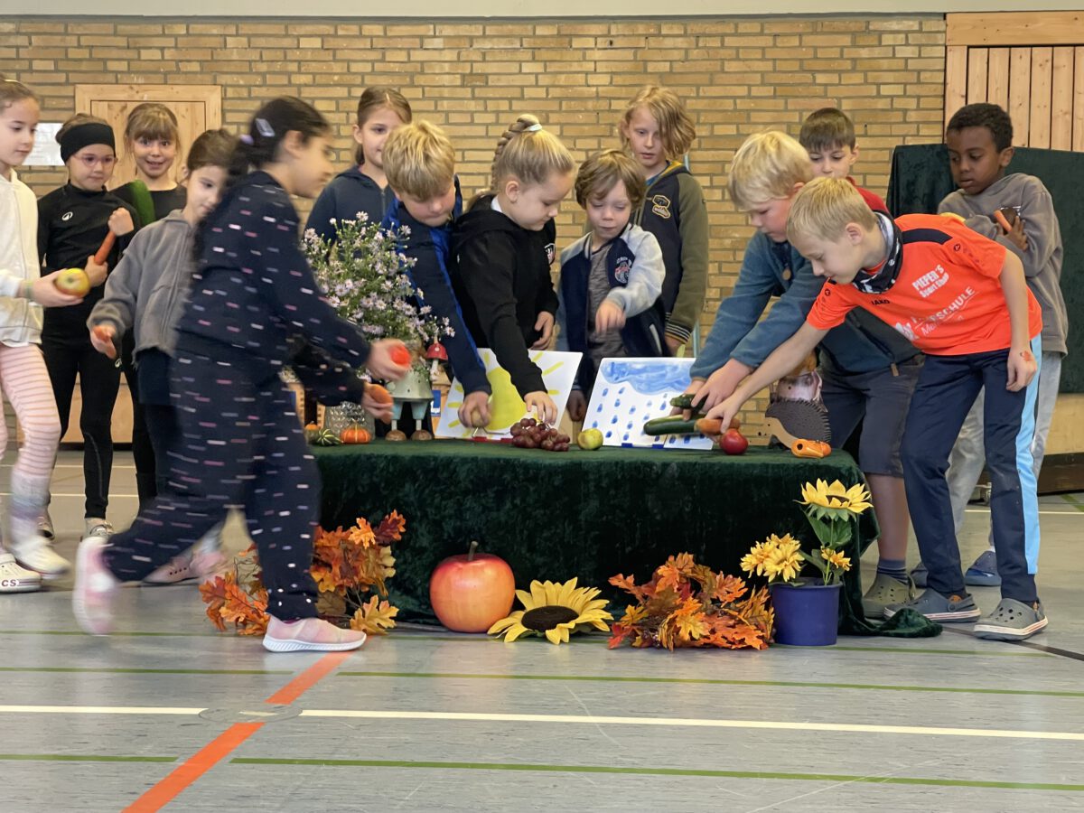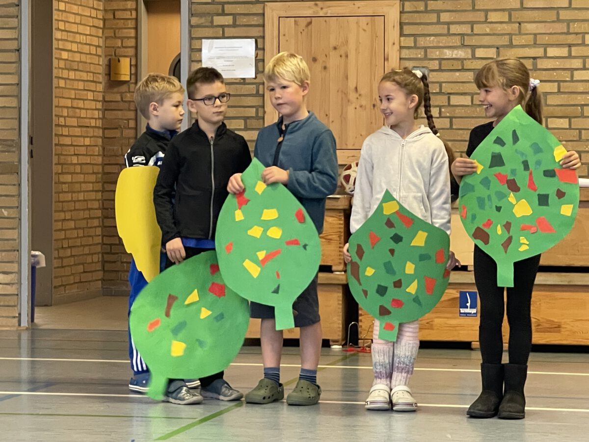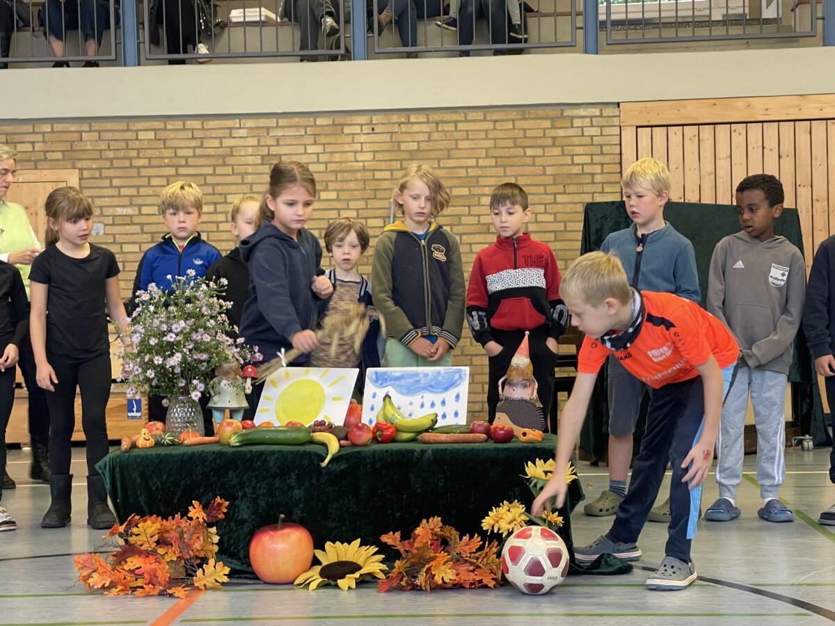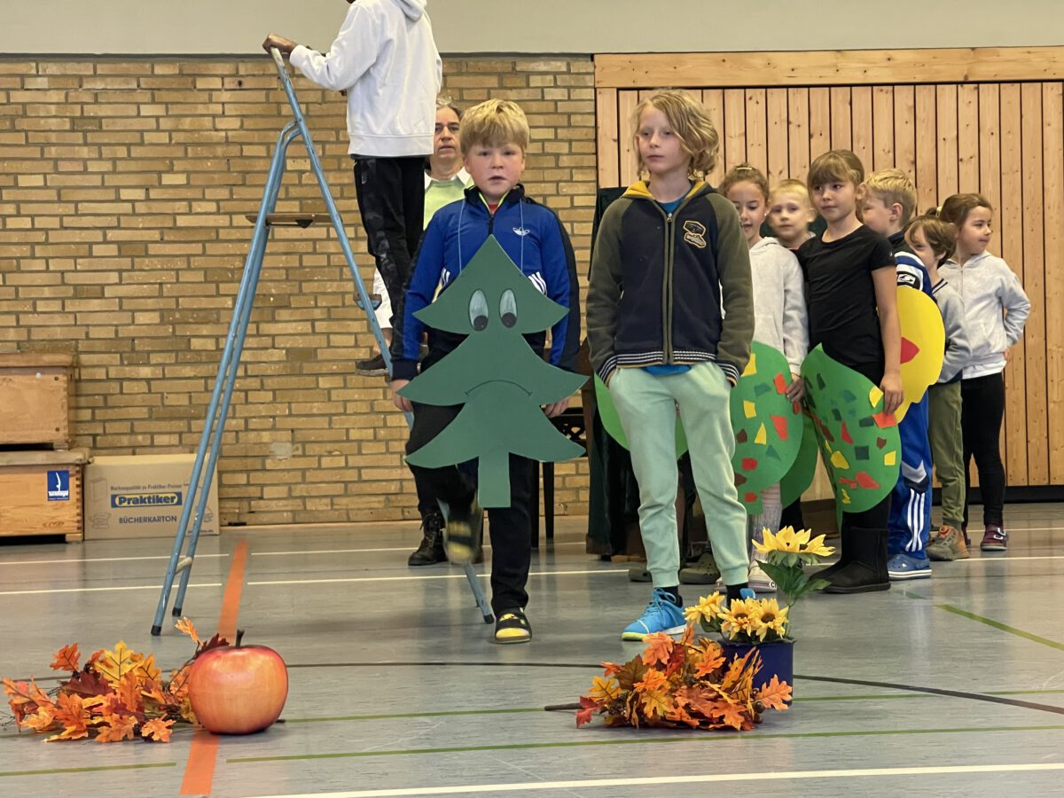 Am letzten Tag vor den Ferien begrüßte die Schülerschar der MCS den bunten Herbst. Gemeinsam trafen sich alle Kinder und Erwachsene in der Turnhalle, um gemeinsam die einstudierten Herbstlieder zu singen. Der Schulchor gab ein kunterbuntes Drachenlied zum Besten, nachdem die Klasse 2b den Herbst die Blätter bunt anmalen ließ und uns die goldenen Garben mit dem Herbstwetter präsentierte. Viel Gelächter war zu hören, als Herr Rixen die Geschichte erzählte, in der Frau Ben Achour und Frau Paul als Igelehepaar den eingebildeten Hasen, gespielte von Frau Winter, im Wettrennen hinters Licht führte und schließlich den Goldtaler als Wetteinsatz mit nach Hause nehmen konnte. Die frohen Herbstlieder noch im Ohr freuten sich alle auf dem Weg zum Sponsorenlauf auf die nahenden Herbstferien.