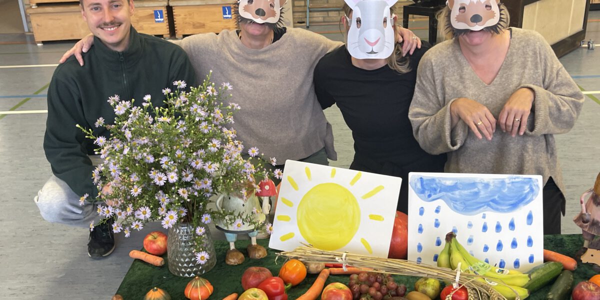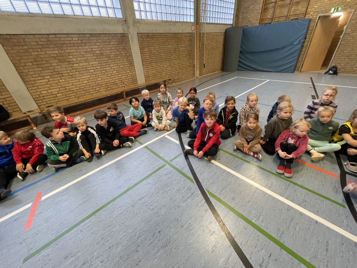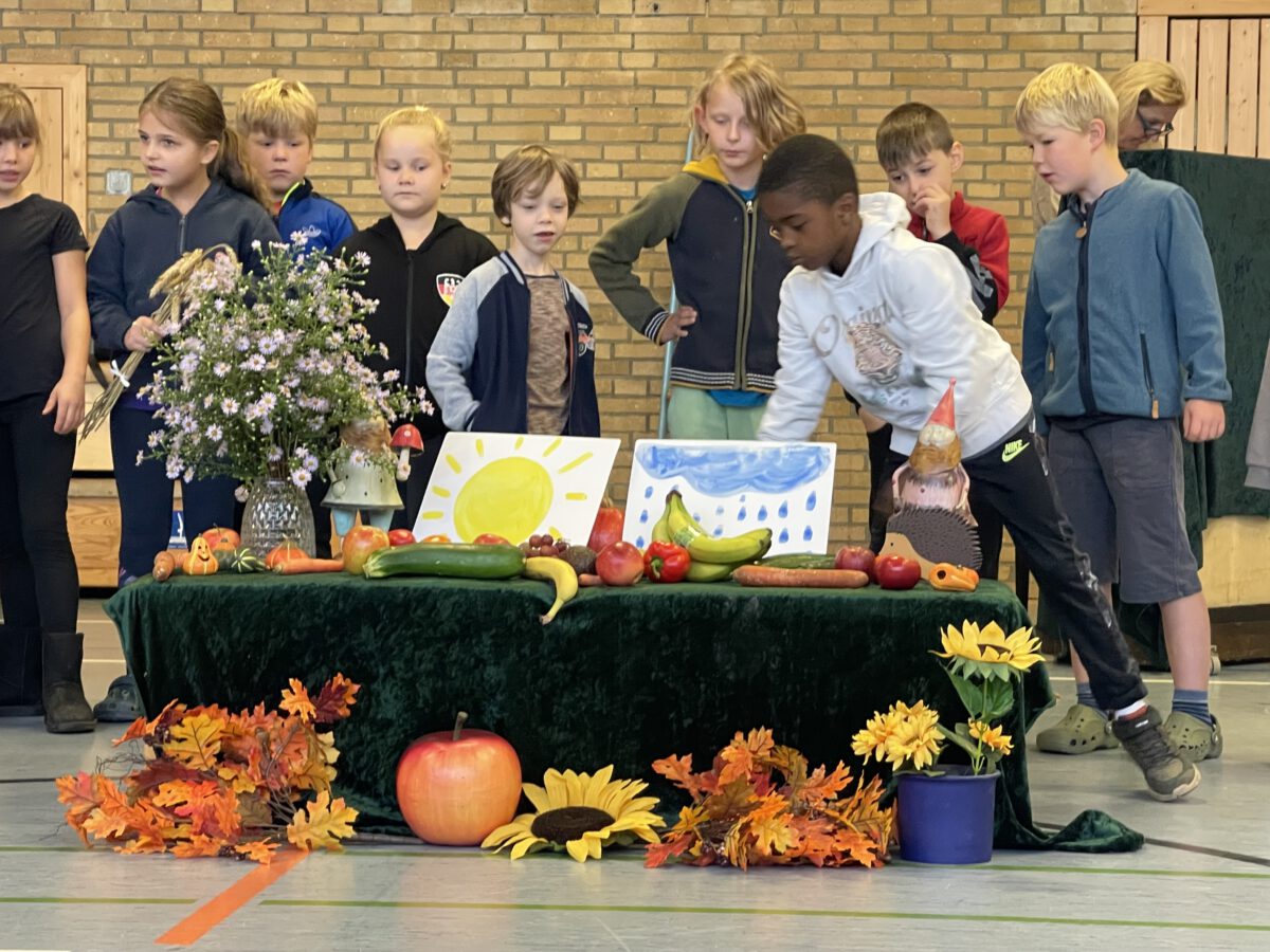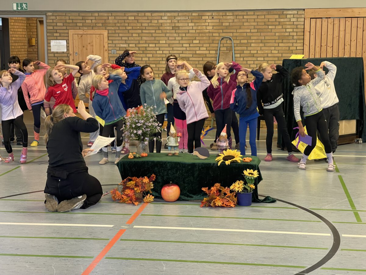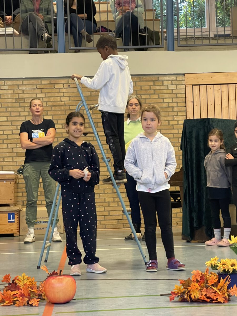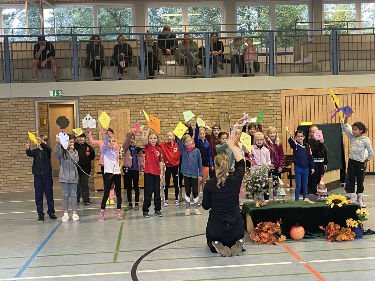 Am letzten Tag vor den Ferien begrüßte die Schülerschar der MCS den bunten Herbst. Gemeinsam trafen sich alle Kinder und Erwachsene in der Turnhalle, um gemeinsam die einstudierten Herbstlieder zu singen. Der Schulchor gab ein kunterbuntes Drachenlied zum Besten, nachdem die Klasse 2b den Herbst die Blätter bunt anmalen ließ und uns die goldenen Garben mit dem Herbstwetter präsentierte. Viel Gelächter war zu hören, als Herr Rixen die Geschichte erzählte, in der Frau Ben Achour und Frau Paul als Igelehepaar den eingebildeten Hasen, gespielte von Frau Winter, im Wettrennen hinters Licht führte und schließlich den Goldtaler als Wetteinsatz mit nach Hause nehmen konnte. Die frohen Herbstlieder noch im Ohr freuten sich alle auf dem Weg zum Sponsorenlauf auf die nahenden Herbstferien.