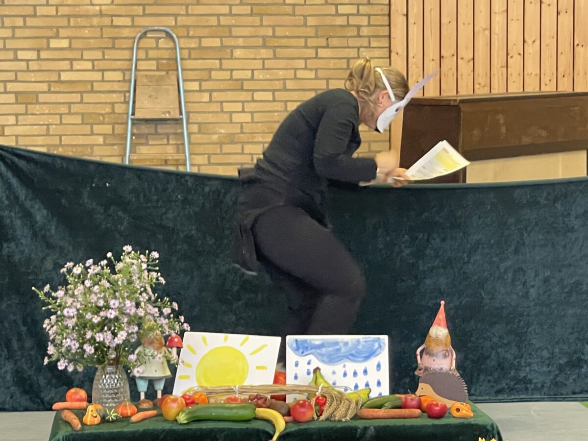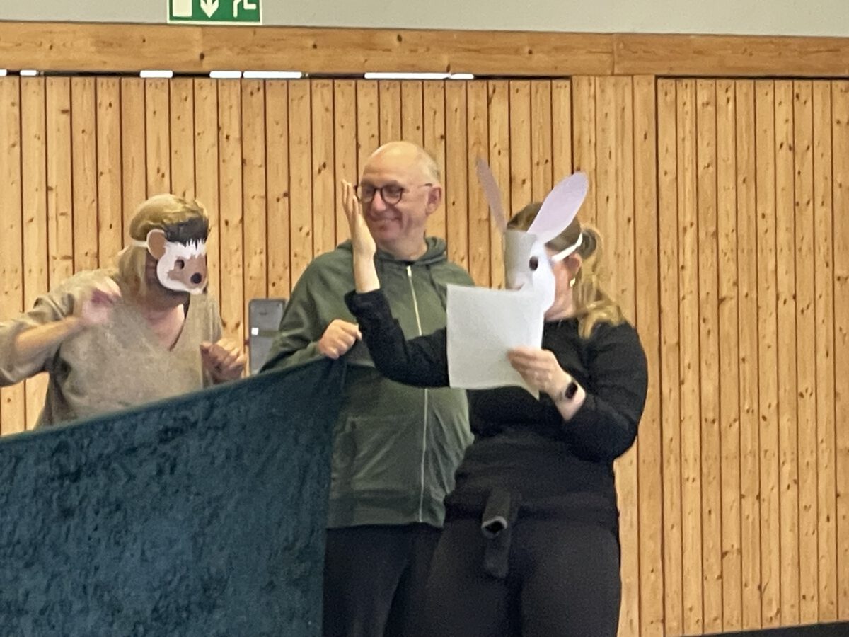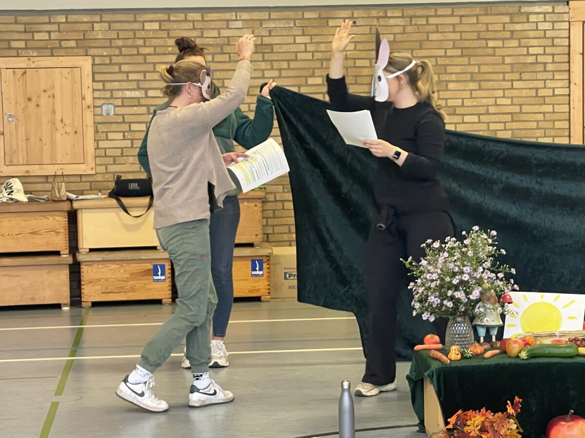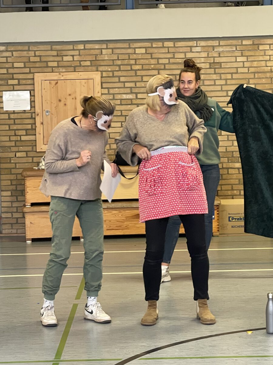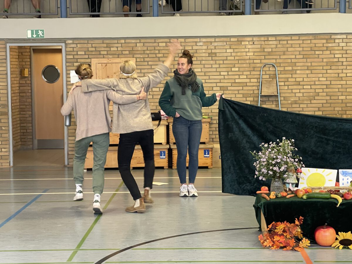 Am letzten Tag vor den Ferien begrüßte die Schülerschar der MCS den bunten Herbst. Gemeinsam trafen sich alle Kinder und Erwachsene in der Turnhalle, um gemeinsam die einstudierten Herbstlieder zu singen. Der Schulchor gab ein kunterbuntes Drachenlied zum Besten, nachdem die Klasse 2b den Herbst die Blätter bunt anmalen ließ und uns die goldenen Garben mit dem Herbstwetter präsentierte. Viel Gelächter war zu hören, als Herr Rixen die Geschichte erzählte, in der Frau Ben Achour und Frau Paul als Igelehepaar den eingebildeten Hasen, gespielte von Frau Winter, im Wettrennen hinters Licht führte und schließlich den Goldtaler als Wetteinsatz mit nach Hause nehmen konnte. Die frohen Herbstlieder noch im Ohr freuten sich alle auf dem Weg zum Sponsorenlauf auf die nahenden Herbstferien.