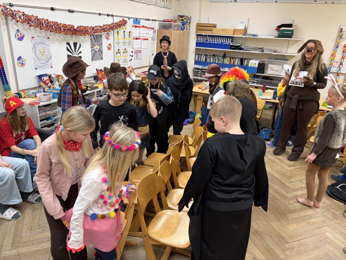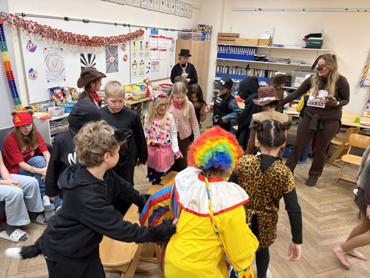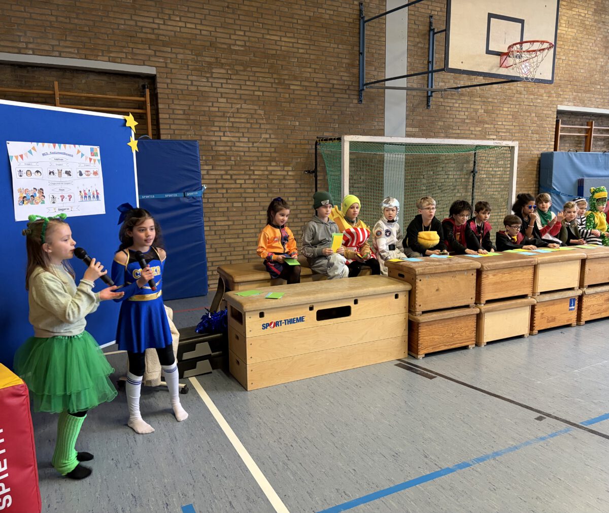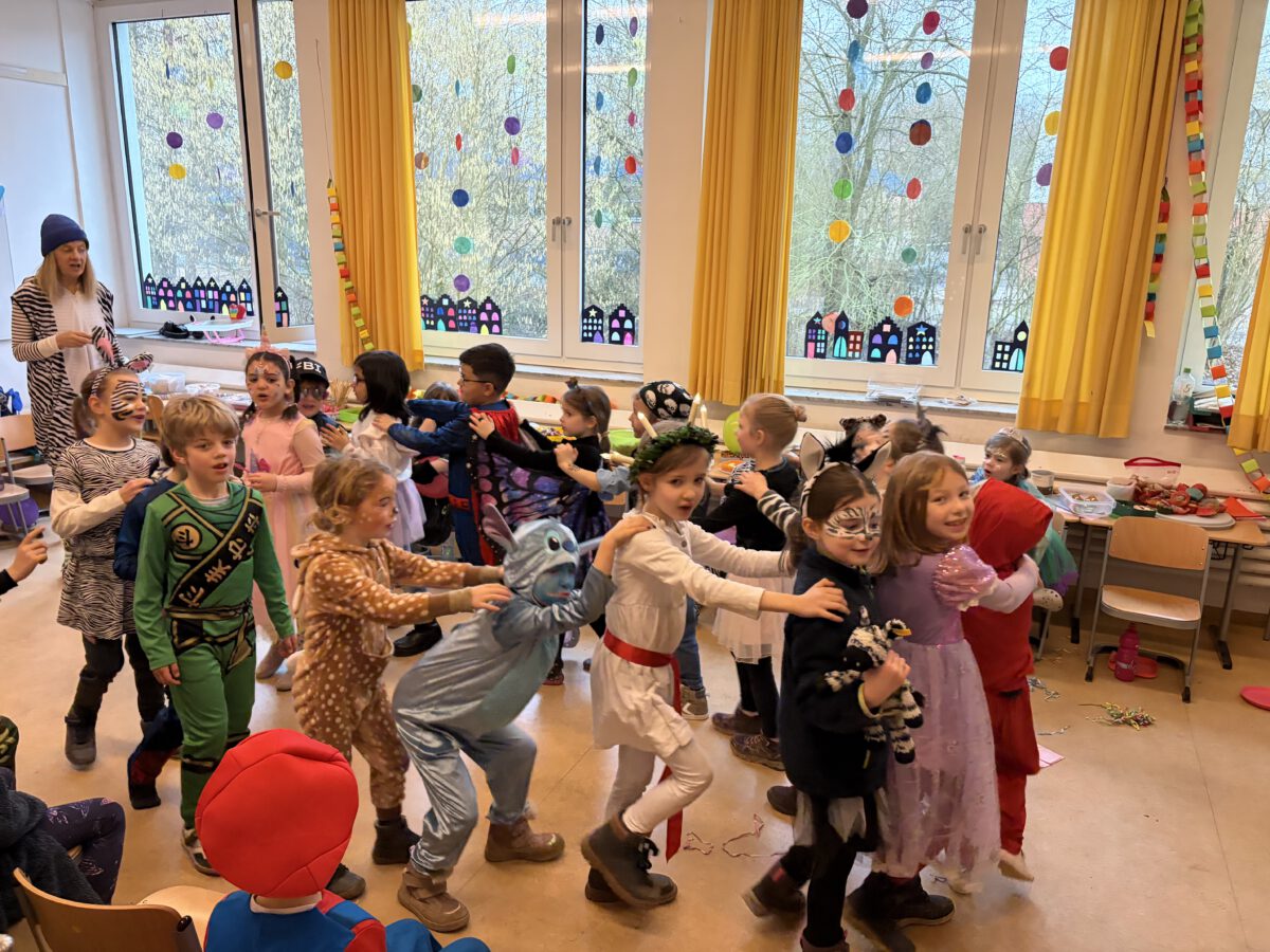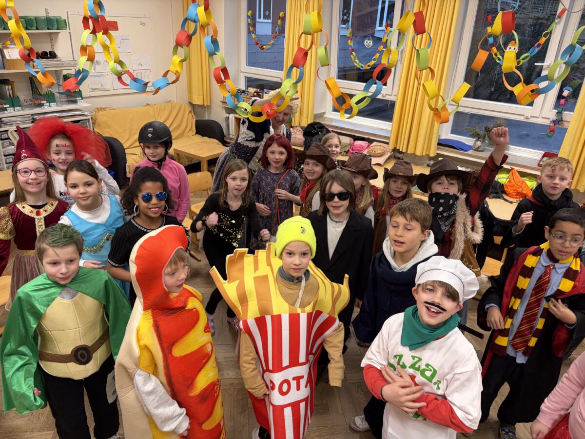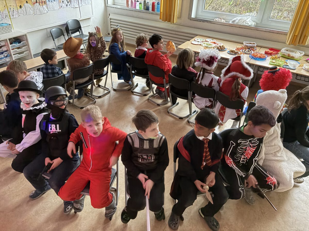 Schon früh am Morgen tummelten sich Ritter, Marienkäfer, Zebras und zahlreiche andere bunte Wesen auf dem Schulhof zum kunterbunten Treiben. Fröhlich und bester Laune feierten die Jecken der MCS in ihren Klassen Karneval. Mit viel Temperament gab es Spiele im Stuhlkreis, Foto-Sessions, Kostümwettbewerbe und Leckereien vom Karnevalsbuffet. Zur Pause schallte heitere Musik über den Schulhof und die Polonäse durch das Schulgebäude fand ihr Ende in einer tanzenden Schülerschar auf dem Hof. In der Turnhalle hatte sich eine Jury beisammen gefunden, um unter der Leitung von Herrn Philipp die besten Kostüme der MCS zu küren. Am Mikrofon unterstützen ihn sehr professionell Clara und Ariana und sorgten für ausgelassene Stimmung. Am Ende tanzte Groß und Klein zur Disco. Anschließend wurde in der OGS weiter gefeiert. Das war ein rundum heiterer Tag.