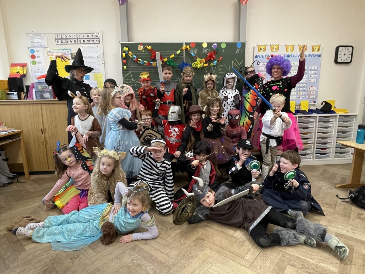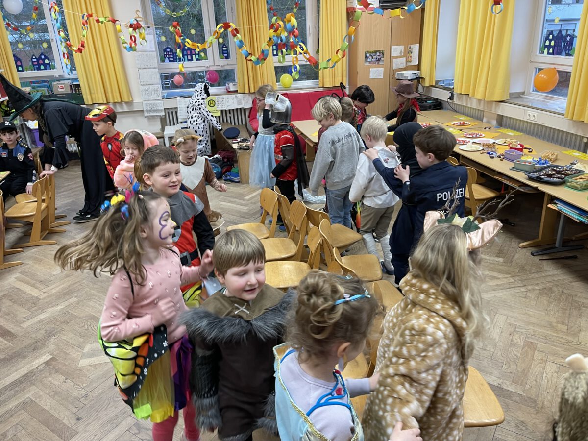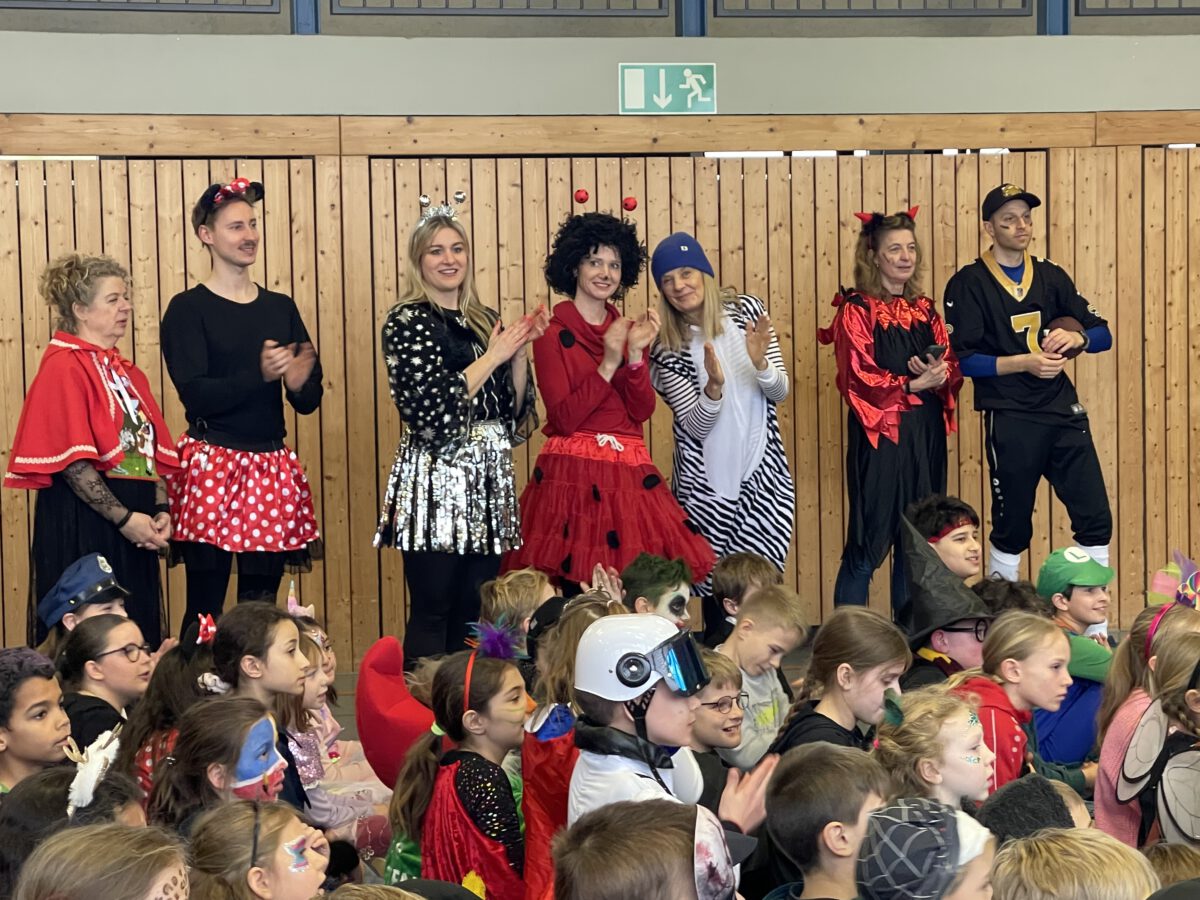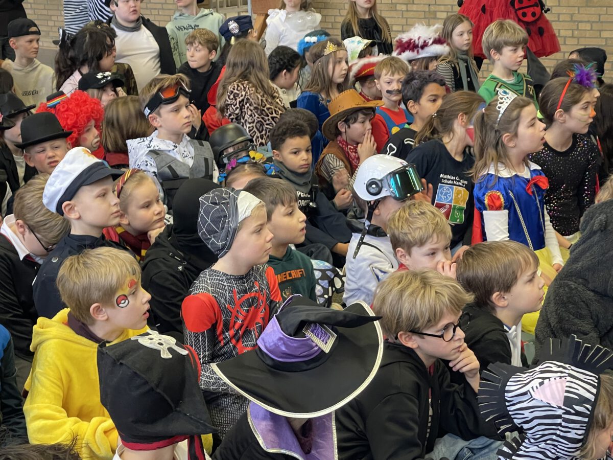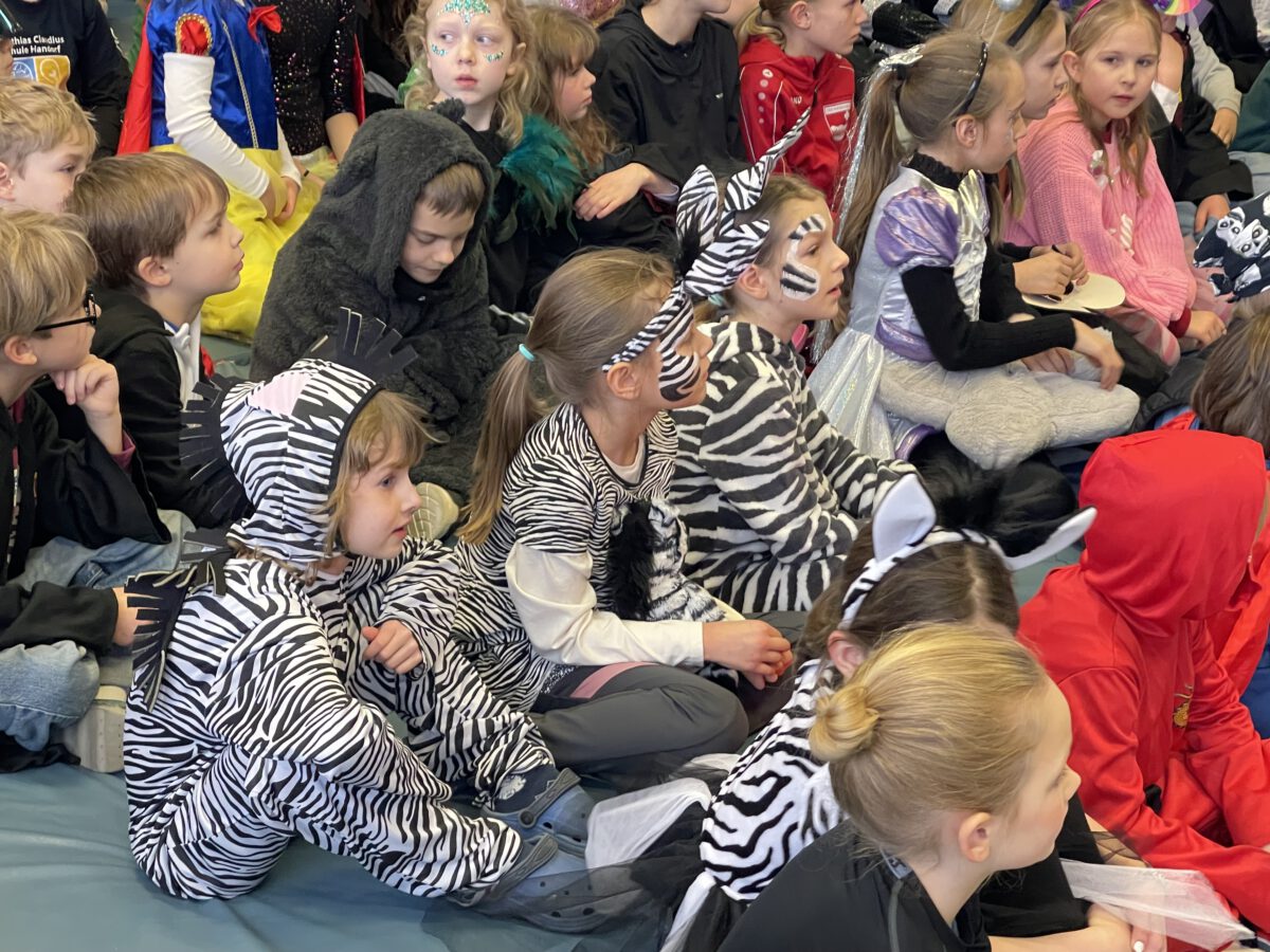 Schon früh am Morgen tummelten sich Ritter, Marienkäfer, Zebras und zahlreiche andere bunte Wesen auf dem Schulhof zum kunterbunten Treiben. Fröhlich und bester Laune feierten die Jecken der MCS in ihren Klassen Karneval. Mit viel Temperament gab es Spiele im Stuhlkreis, Foto-Sessions, Kostümwettbewerbe und Leckereien vom Karnevalsbuffet. Zur Pause schallte heitere Musik über den Schulhof und die Polonäse durch das Schulgebäude fand ihr Ende in einer tanzenden Schülerschar auf dem Hof. In der Turnhalle hatte sich eine Jury beisammen gefunden, um unter der Leitung von Herrn Philipp die besten Kostüme der MCS zu küren. Am Mikrofon unterstützen ihn sehr professionell Clara und Ariana und sorgten für ausgelassene Stimmung. Am Ende tanzte Groß und Klein zur Disco. Anschließend wurde in der OGS weiter gefeiert. Das war ein rundum heiterer Tag.
