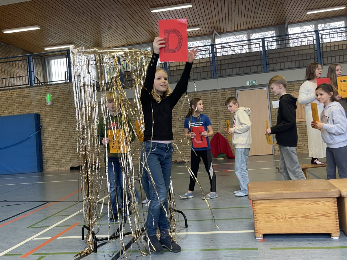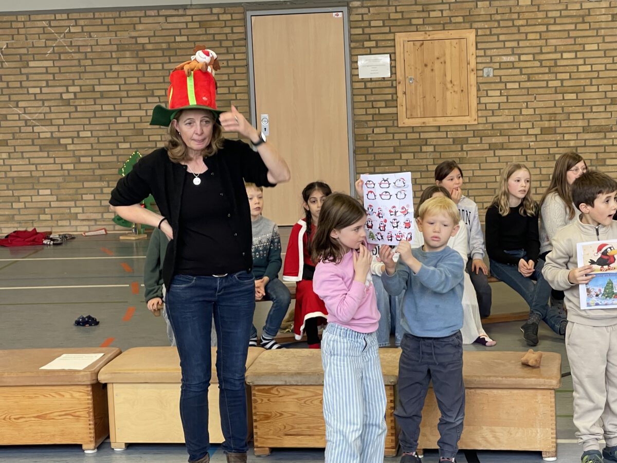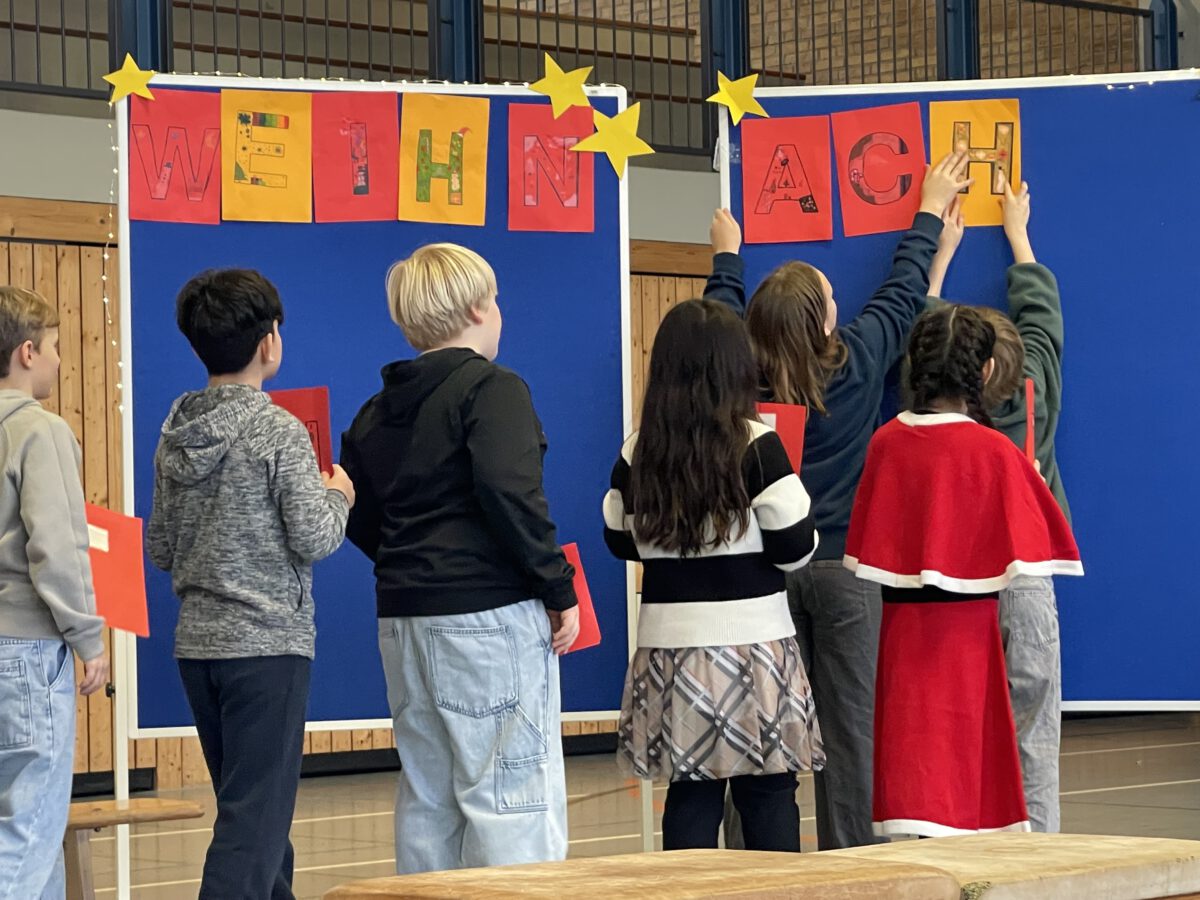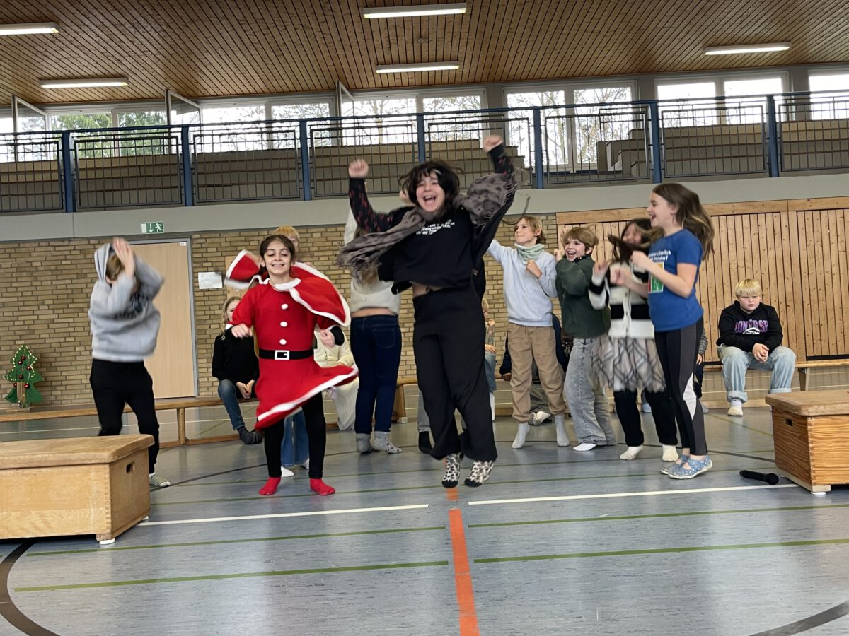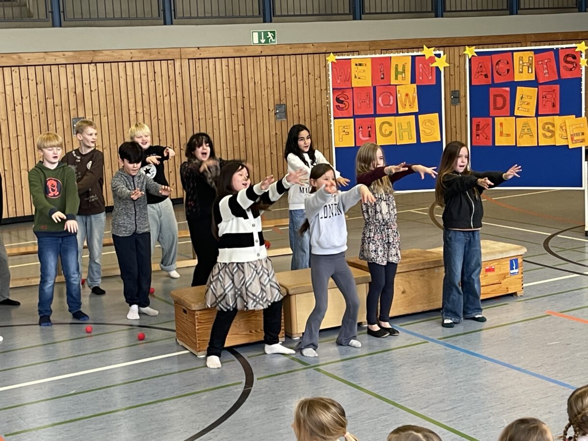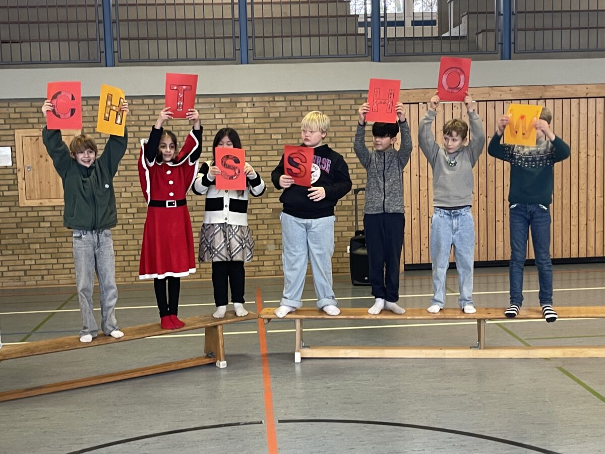 Am letzten Schultag begeisterte die Klasse 4b die MCS mit ihrer lustigen, farbenfrohen und kreativen Weihnachtsshow. Mit Musik, Tanz, Zauberei, Dichtkunst und Theaterspiel bescherten sie allen Anwesenden in der Turnhalle einen wundervollen Schulabschluss. Belohnt wurden die tollen Darstellerinnen und Darsteller mit einem tosenden Applaus. Was für eine grandiose Show! Anschließend lüftete der Weihnachtswichtel Matti noch das Geheimnis um die Rätselwand, welche die Kinder durch die Adventszeit hindurch lösen mussten. So freuten sich alle beschwingt über eine kleine leckere Schoko-Überraschung am Ausgang auf ihrem Weg in die Weihnachtsferien.
