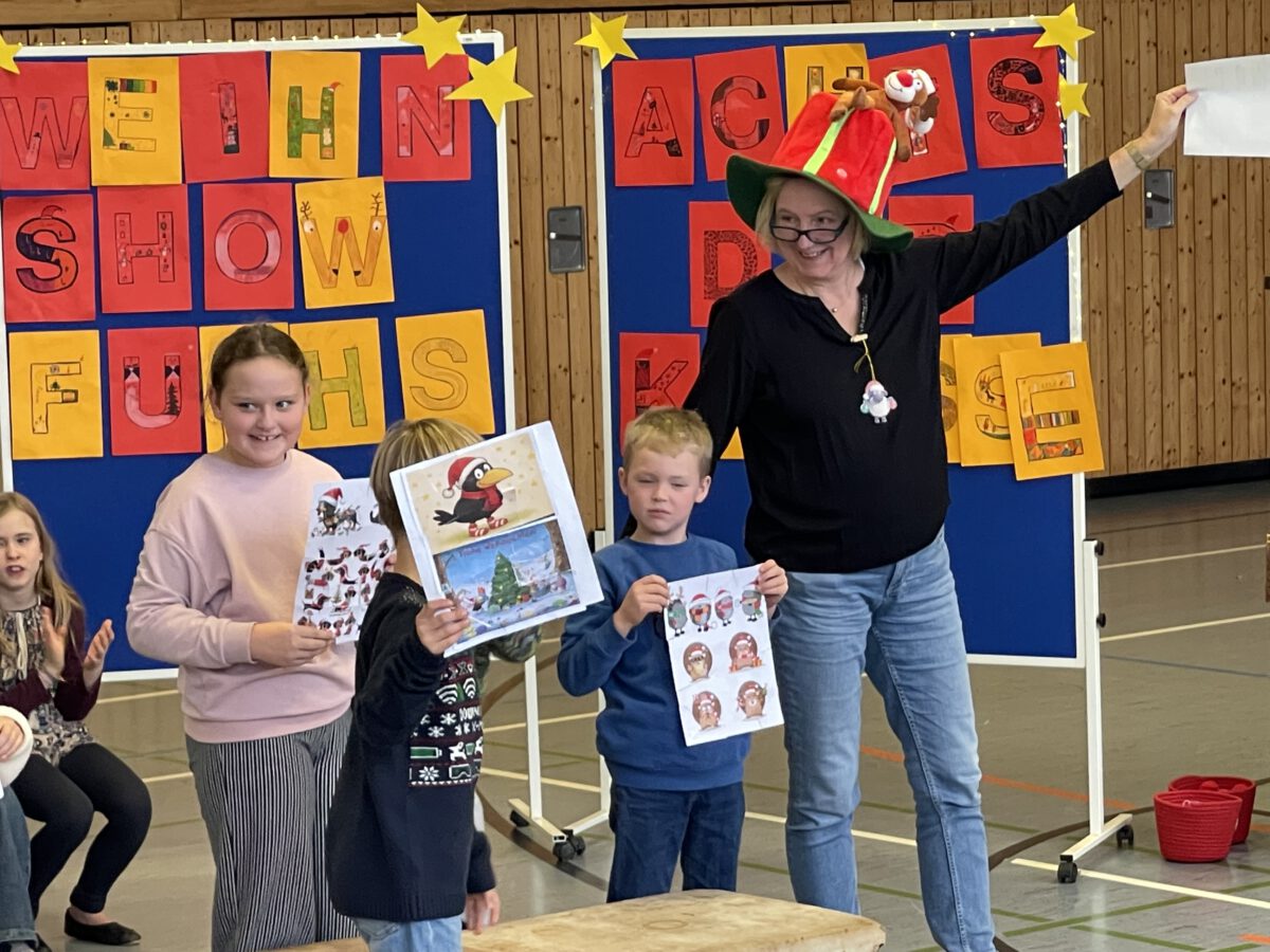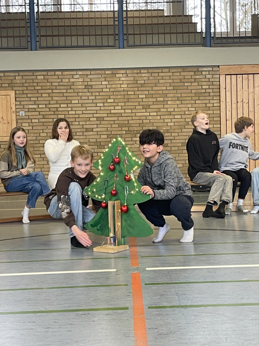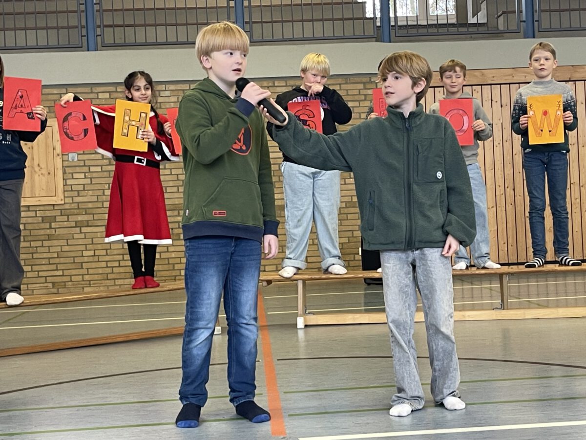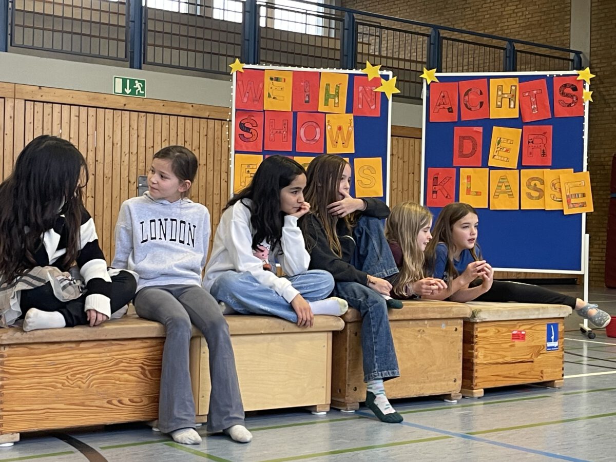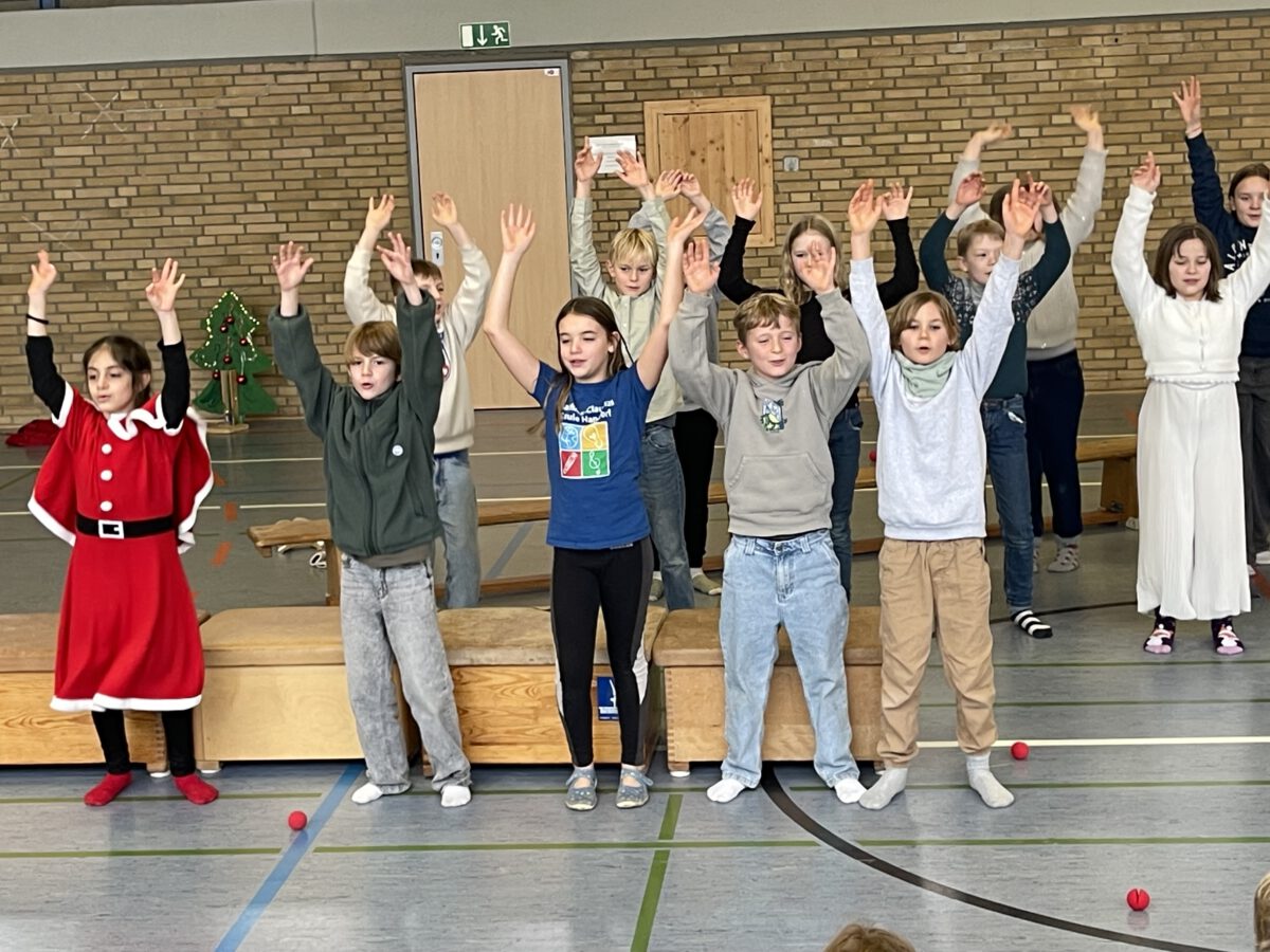 Am letzten Schultag begeisterte die Klasse 4b die MCS mit ihrer lustigen, farbenfrohen und kreativen Weihnachtsshow. Mit Musik, Tanz, Zauberei, Dichtkunst und Theaterspiel bescherten sie allen Anwesenden in der Turnhalle einen wundervollen Schulabschluss. Belohnt wurden die tollen Darstellerinnen und Darsteller mit einem tosenden Applaus. Was für eine grandiose Show! Anschließend lüftete der Weihnachtswichtel Matti noch das Geheimnis um die Rätselwand, welche die Kinder durch die Adventszeit hindurch lösen mussten. So freuten sich alle beschwingt über eine kleine leckere Schoko-Überraschung am Ausgang auf ihrem Weg in die Weihnachtsferien.